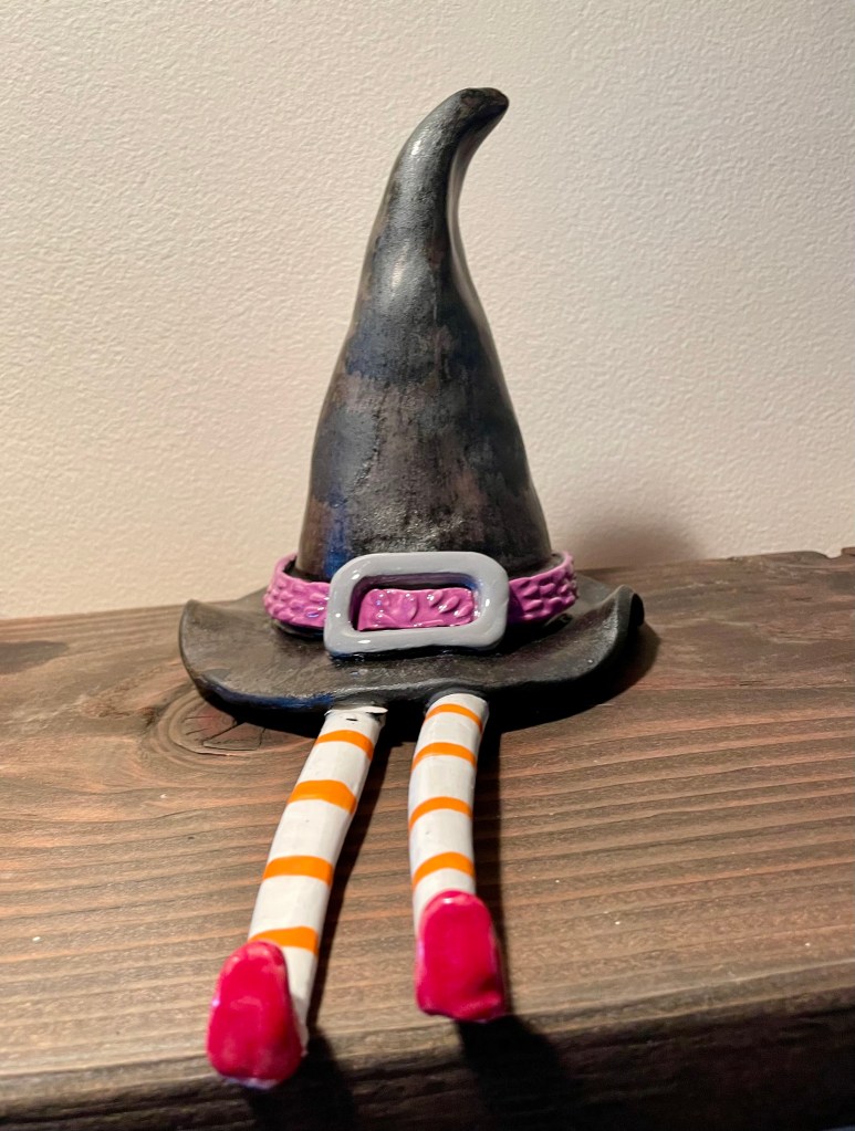 Its time to decorate for Halloween with your own creations.  Engage your creativity, learn, design and craft your own unique Wicked Witch Hat with dangling legs.  Perfect for decorating your mantel.. Suitable for all skill levels, this workshop offers a fun, hands-on whimsical occasion.